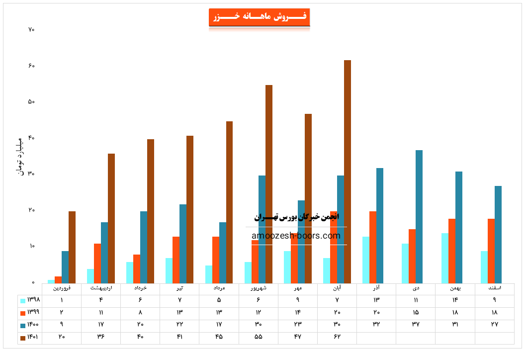 نماد خزر (شرکت فنرسازی زر) در آبان ماه ۱۴۰1 حدود مبلغ 62 میلیارد تومان درآمد داشته که این میزان در مقایسه با ماه گذشته 32% و همچنین در مقایسه با مدت مشابه سال گذشته 107% رشد درآمد پیدا کرده است.
