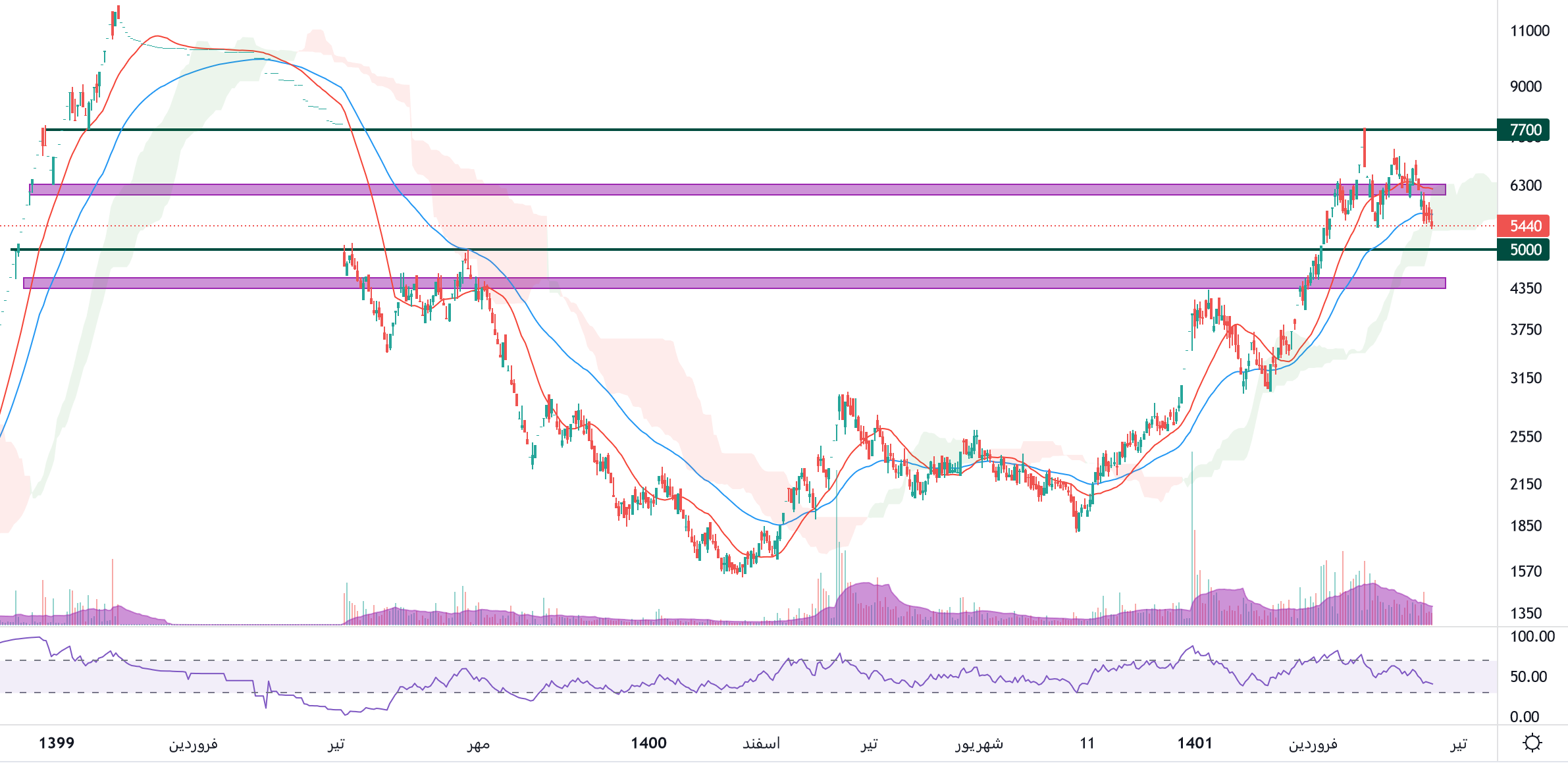 نماد خزر در فاز اصلاحی میباشد، اولین حمایت پیش روی 5000 ریال خواهد بود، در صورت شدت یافتنفشار فروش و از دست رفتن این محدوده حمایتی، حمایت بعدی 4300 ریال در نظر گرفته خواهد شد، همچنین در صورتی که قیمت سهم خزر در محدوده حمایتی تثبیت شودريال حرکت سهم تا 6300 و 7700 ریال محتمل خواهد بود، در حال حاضر پیشنهاد به ورود داده نمیشود.