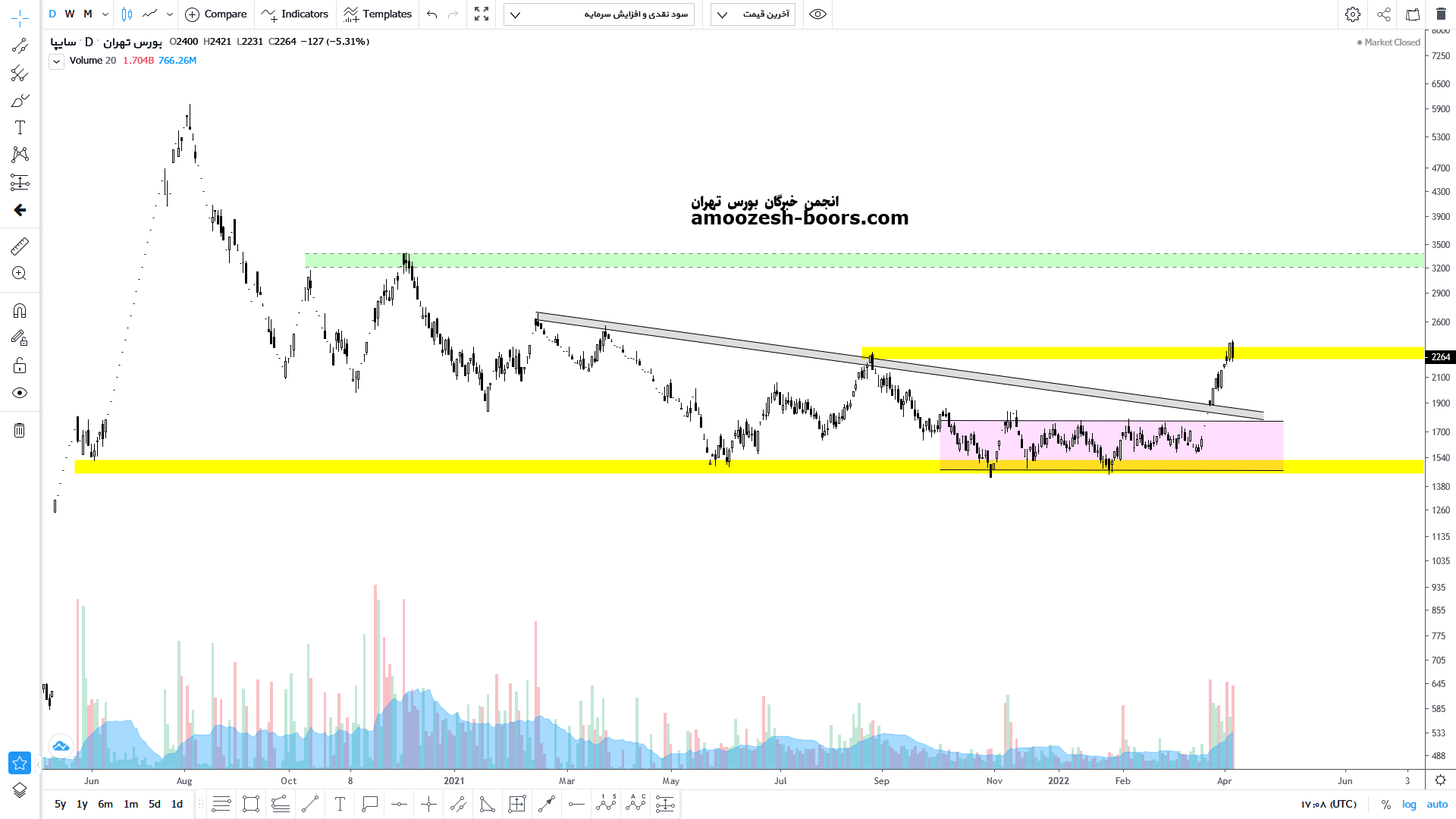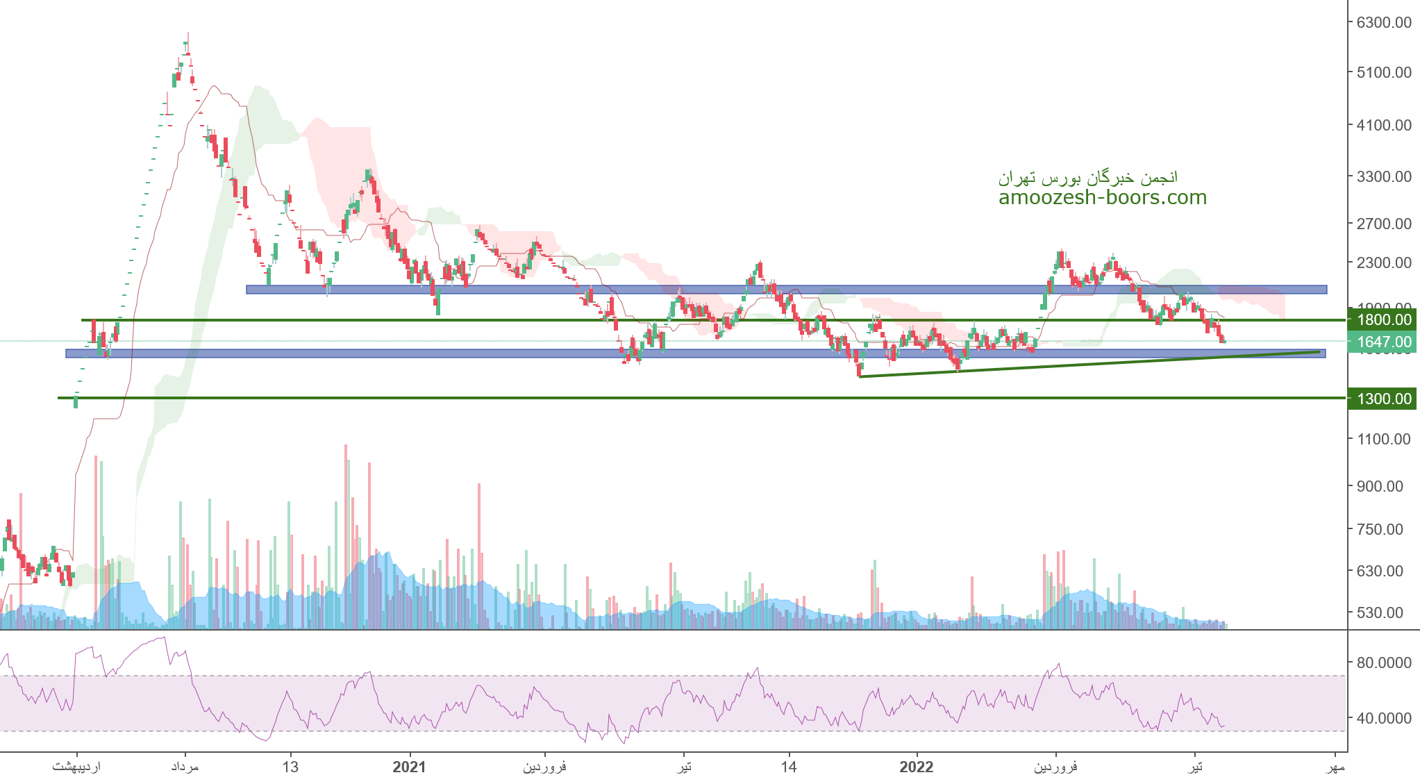 قیمت پس از خروج از کانال خنثی و همچنین شکست پرقدرت خط روند نزولی خود رشدی را تا محدوده مقاومتی مهم ۲۲۵ تومان داشته است. با توجه به کندل آخر پیشبینی میشود که اصلاح کوتاهمدتی را برای قیمت داشته باشیم درصورت حمله مجدد به این محدوده مقاومتی و شکست آن قیمت میتواند تا محدوده ۳۲۰ تومان رشد کند اما در صورت شکلگیری اصلاح محدوده حمایتی ۱۸۰ تومان را پیش روی خود دارد.