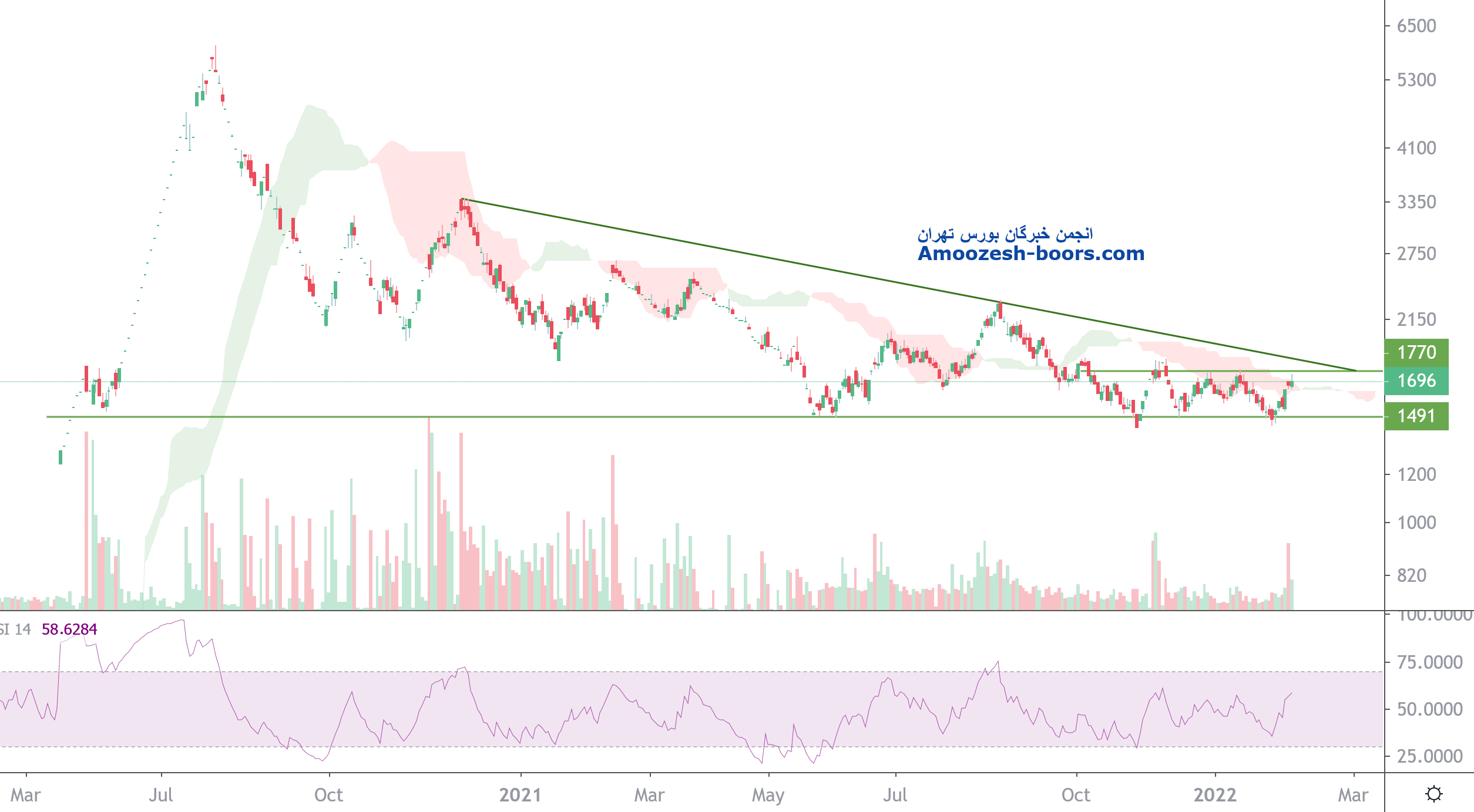 قیمت در نزدیکی محدوده مقاومتی 1800 ریال قرار داشته و با توجه به سابقه تاریخی چارت عموما افزایش حجم معاملات موجب اصلاح قیمتی میگردد و در صورت نزول قیمت حمایت سهم محدوده استاتیک 1470 ریال در نظر گرفته خواهد شد.