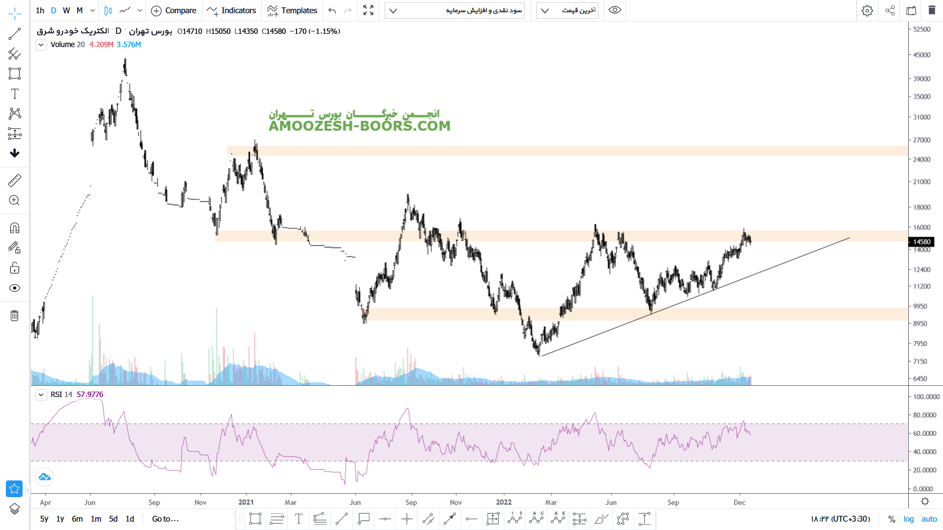 قیمت سهم خشرق پس از حمایت از ناحیه ۱۱۰۰ تومان اکنون بر روی مقاومت مهم ناحیه ۱۵۰۰ تومان قرار دارد که میتواند با شکست و عبور از این ناحیه مقاومتی تا سقف مهم ناحیه ۲۶۰۰ تومان رشد خود را ادامه دهد اما در صورت عدم توانایی از عبور از این مقاومت مهم حمایت خط روند صعودی خود را در پیش دارد.