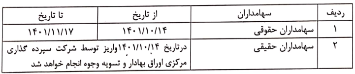احتراما بدین وسیله به استحضار میرساند با توجه به تصمیمات اتخاذ شده در مجمع عمومی عادی سالیانه سهم خشرق منتهی به تاریخ ۱۴۰۰/۱۲/۲۹ مبنی بر پرداخت سود نقدی به مبلغ ۳۰۰ریال به ازای هر سهم به سهامدارن محترم ، برنامه زمان بندی پرداخت سود سهام مذکور به شرح ذیل اعلام میگردد: