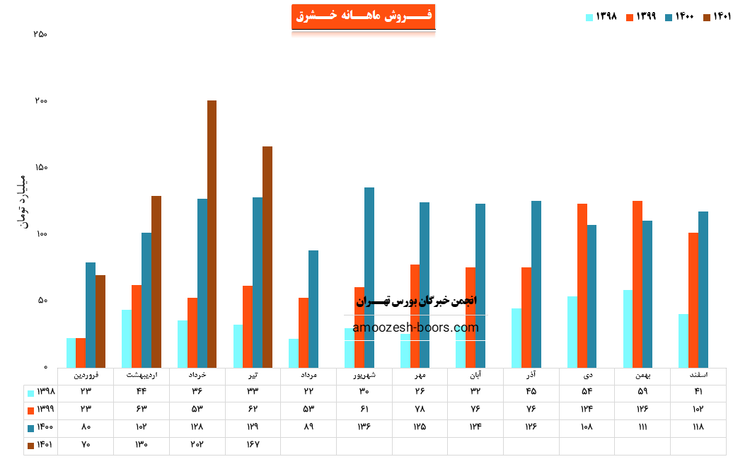 سهم خشرق در تیر ماه حدود بیش از 27300 دست از محصولات خود را به فروش رسانده که این میزان در مقایسه با حجم فروش ماه گذشته خود حدود 16% کاهش پیدا کرده است.