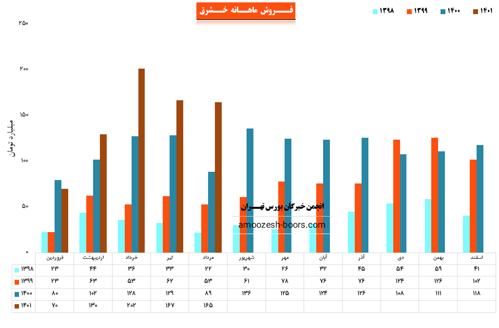 سهم خشرق (شـركت الكتـريك خودرو شــرق) در تیر ماه ۱۴۰1 حدود مبلغ 167 میلیارد تومان درآمد داشته که این میزان در مقایسه با ماه گذشته 17% کاهش و همچنین در مقایسه با مدت مشابه سال گذشته 29% رشد درآمد پیدا کرده است.