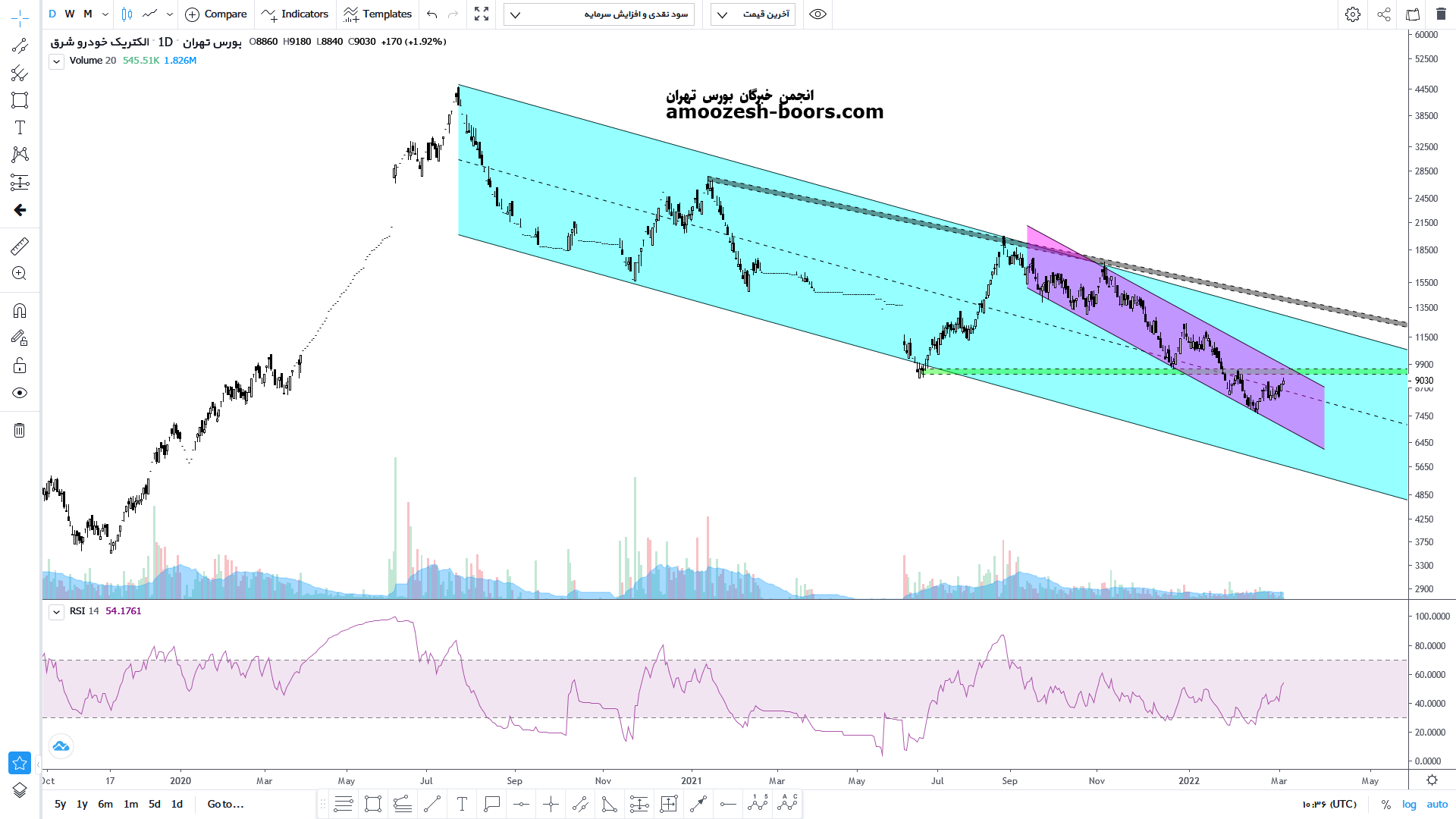 قیمت پس از رشد و برخورد به محدوده مقاومتی سقف کانال نزولی درازمدت خود مجدداً اصلاحی را در قالب یک کانال نزولی کوتاهمدت آغاز کرده و اکنون پس از رشد در روزهای اخیر به سقف کانال نزولی کوتاهمدت خود و همچنین مقاومت کلاسیکی محدوده ۹۹۰ تا ۱۰۰۰ تومان رسیده است که در صورت بروز واکنش منفی به این محدوده مقاومتی قوی می تواند مجددا تا کف کانال نزولی اصلاح خود را ادامه دهد اما در صورت توانایی شکست در این محدوده مقاومتی قوی میتواند رشدی را تا محدوده سقف کانال نزولی درازمدت خود تجربه کند.