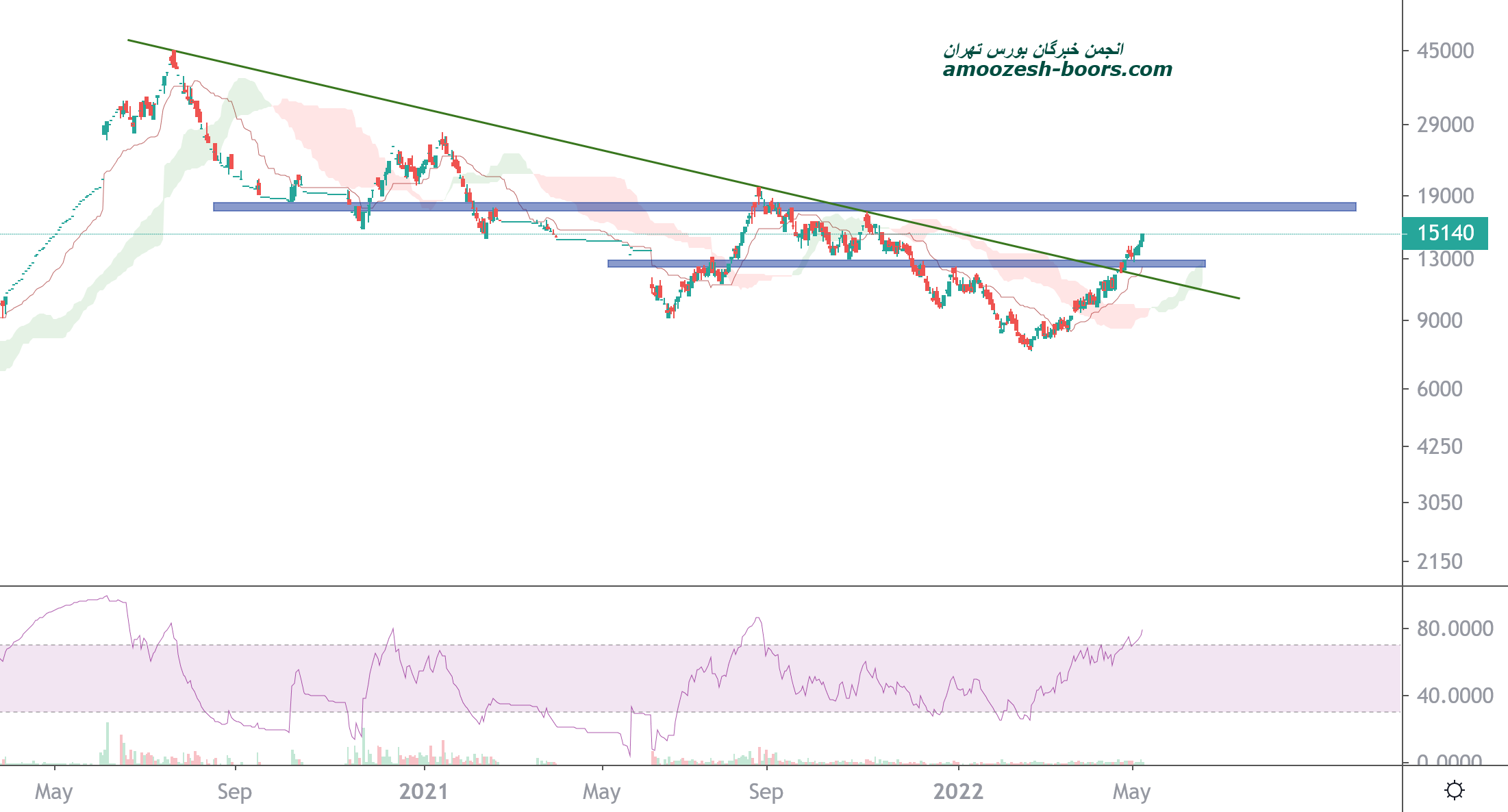 قیمت موفق به شکست مقاومت خط داینامیک نزولی و محدوده مقاومتی استاتیک شده و در حال حاضر با افزایش فشار تقاضا در حال ادامه دادن حرکت صعودی خود میباشد در صورت صعود اولین مقاومت سهم محدوده 18000 ریال ارزیابی میگردد و در صورتی که سهم وارد فاز اصلاحی شود حمایت های اول و دوم سهم به ترتیب 13000 و 11000 ریال میباشد که در این صورت حد ضرر دوستان کوتاه مدتی فعال خواهد شد.