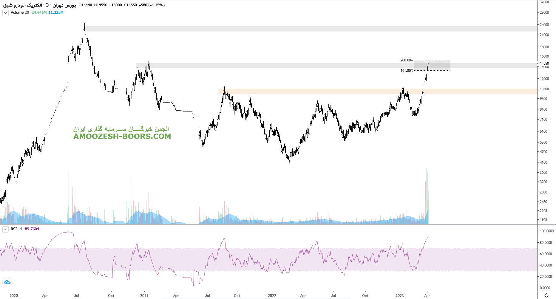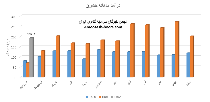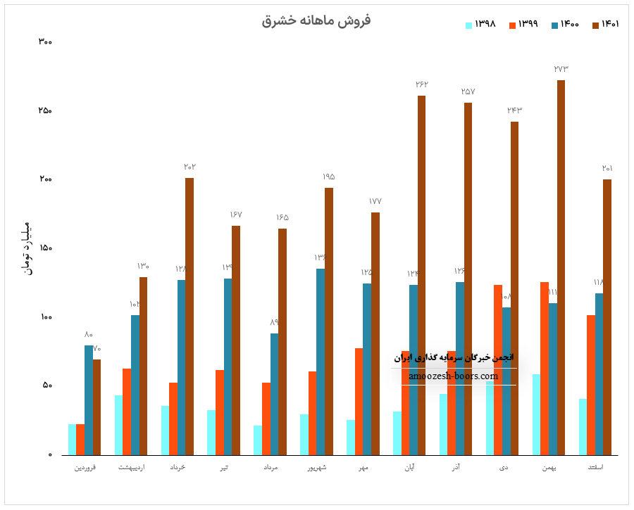 سهم خشرق (شـركت الكتـريك خودرو شــرق) در اسفند ماه ۱۴۰1 حدود مبلغ 201 میلیارد تومان درآمد داشته که این میزان در مقایسه با ماه گذشته 26% کاهش و همچنین در مقایسه با مدت مشابه سال گذشته 70% رشد درآمد پیدا کرده است.
