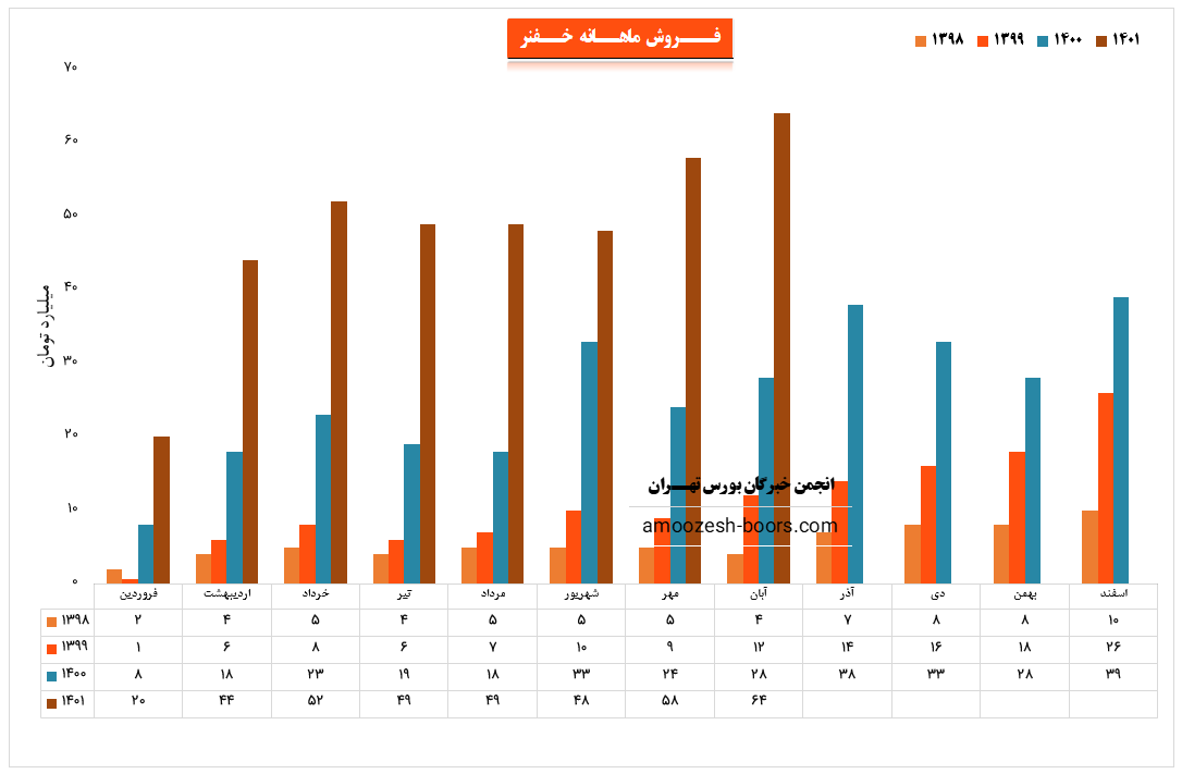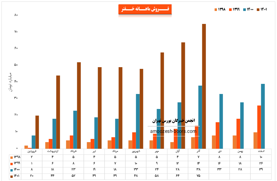 نماد خفنر در آذر ماه حدود بیش از 1090 تن از محصولات خود را به فروش رسانده که این میزان در مقایسه با حجم فروش ماه گذشته خود حدود 20% افزایش پیدا کرده است.