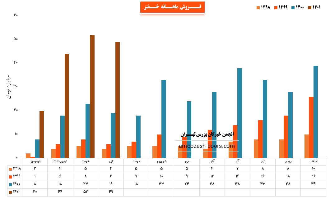 نماد خفنر (شرکت فنرسازی خاور) در مرداد ماه ۱۴۰1 حدود مبلغ 49 میلیارد تومان درآمد داشته که این میزان در مقایسه با ماه گذشته بدون تغییر و همچنین در مقایسه با مدت مشابه سال گذشته 172% رشد درآمد پیدا کرده است.