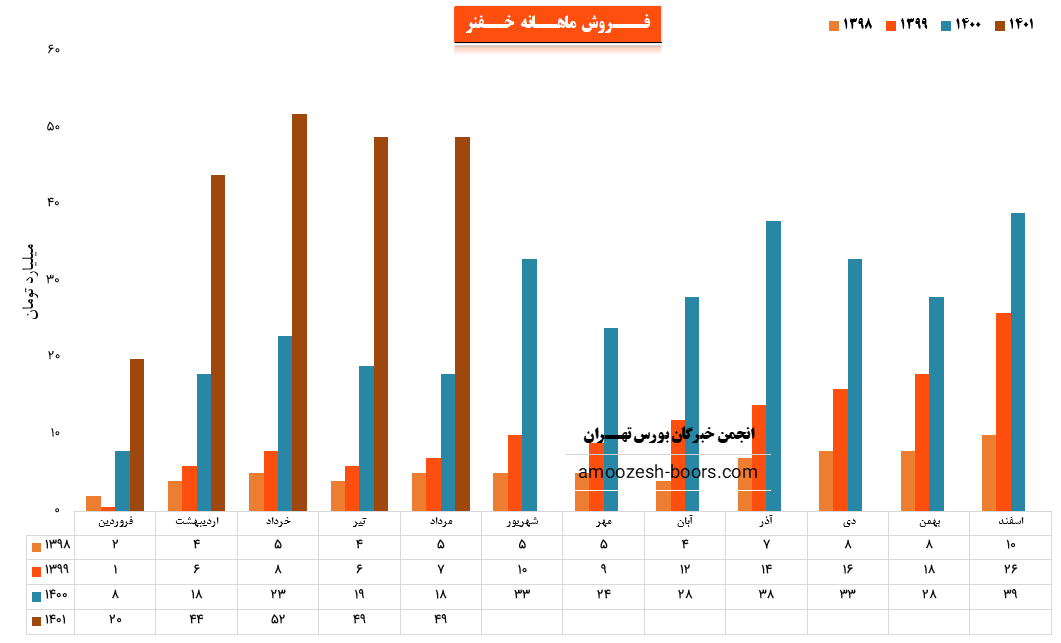 نماد خفنر در مرداد ماه حدود بیش از 702 تن از محصولات خود را به فروش رسانده که این میزان در مقایسه با حجم فروش ماه گذشته خود حدود 10% کاهش پیدا کرده است.