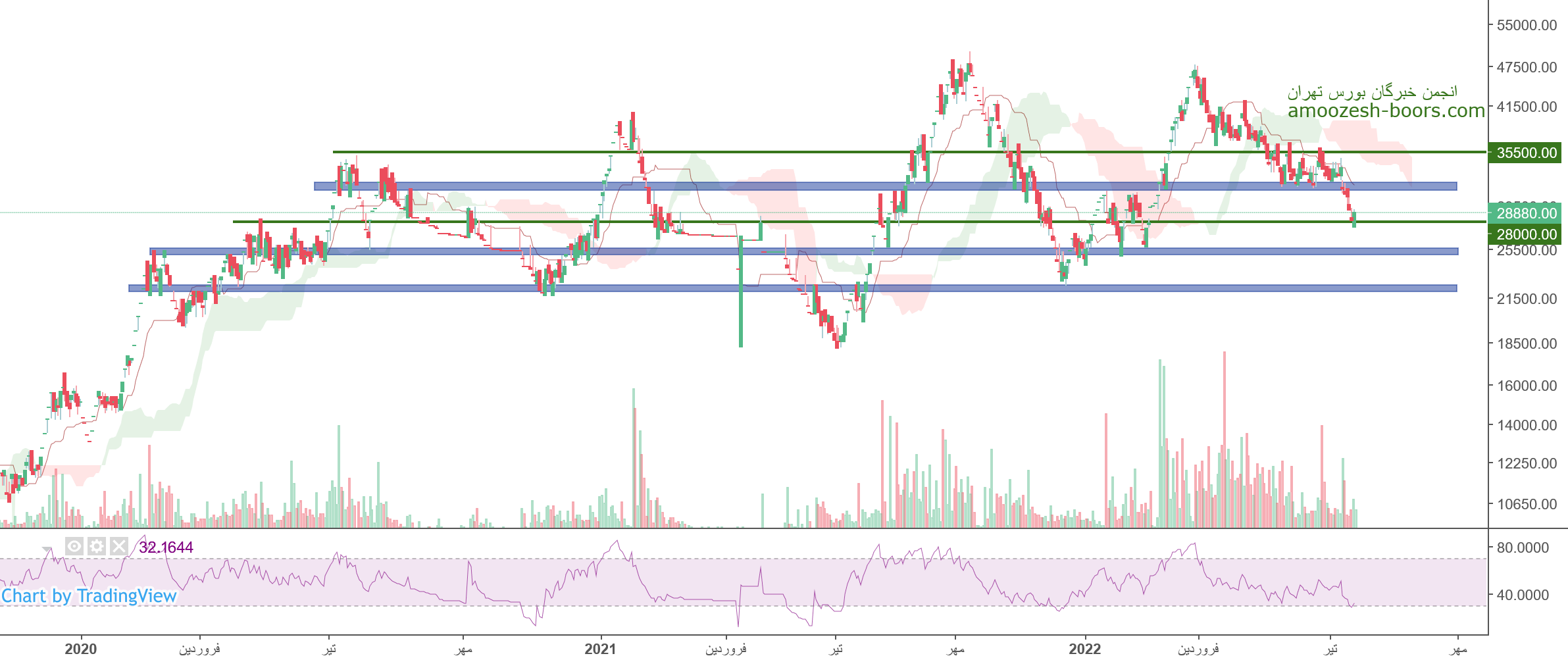 قیمت سهم خلنت در حال حاضر حمایت 28000 ریال را دارا میباشد، در صورت تثبیت قیمت، حرکت سهم تا 32000 ریال دور از ذهن نخواهد بود، همچنین در صورت از دست رفتن این حمایت، حمایت بعدی 25000 ریال خواهد بود که در این صورت حد ضرر فعال میگردد.