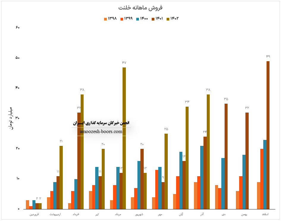درآمد آبان ماه سال 1402 سهم خلنت 33.6 میلیارد تومان بوده است که در مقایسه با ماه گذشته 33% افزایش داشته است.