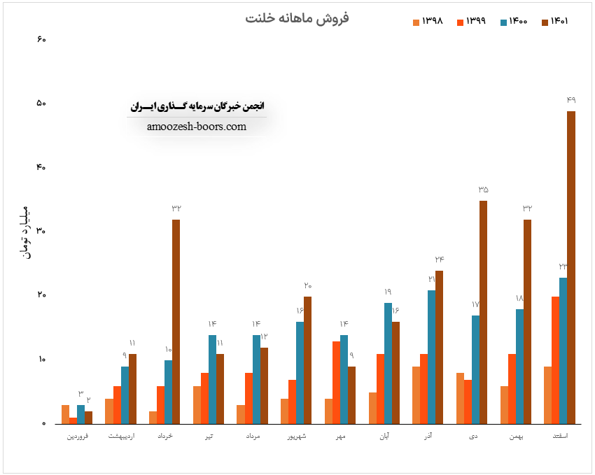 نماد خلنت در اسفند ماه حدود بیش از 519 تن از محصولات خود را به فروش رسانده که این میزان در مقایسه با حجم فروش ماه گذشته خود حدود 41% افزایش پیدا کرده است.