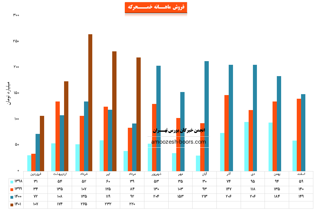 مقدار فروش نماد خمحرکه نسبت به ماه قبل رشد 14.15 درصدی را ثبت کردهاست و نسبت به میانگین ماههای گذشته نیز 28.25 درصد رشد داشتهاست.