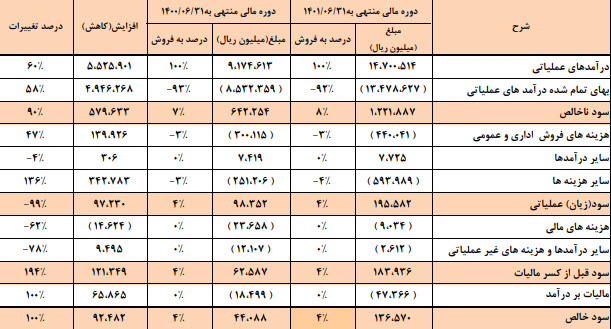 نماد خمحرکه (شرکت صنعتی نیرو محرکه) بر اساس گزارش صورت مالی 6 ماهه خمحرکه موفق شده ازای هر سهم 24 ریال سود محقق کرده است که نسبت به دوره مشابه سال قبل (200%) افزایش داشته است همچنین سود ناخالص 90% رشد ، سود عملیاتی99% افت و هزینه های مالی62% افت داشته است.درآمدهای عملیاتی نیز 60% رشد داشته است، این افزایش عمدتا ناشی ازدریافت افزایش نرخ محصولات خانواده گیربکس در پایان سال 1400 و شش ماهه اول سال 1401بوده است. سایر تغییرات مهم دوره به شرح جدول زیر میباشد :