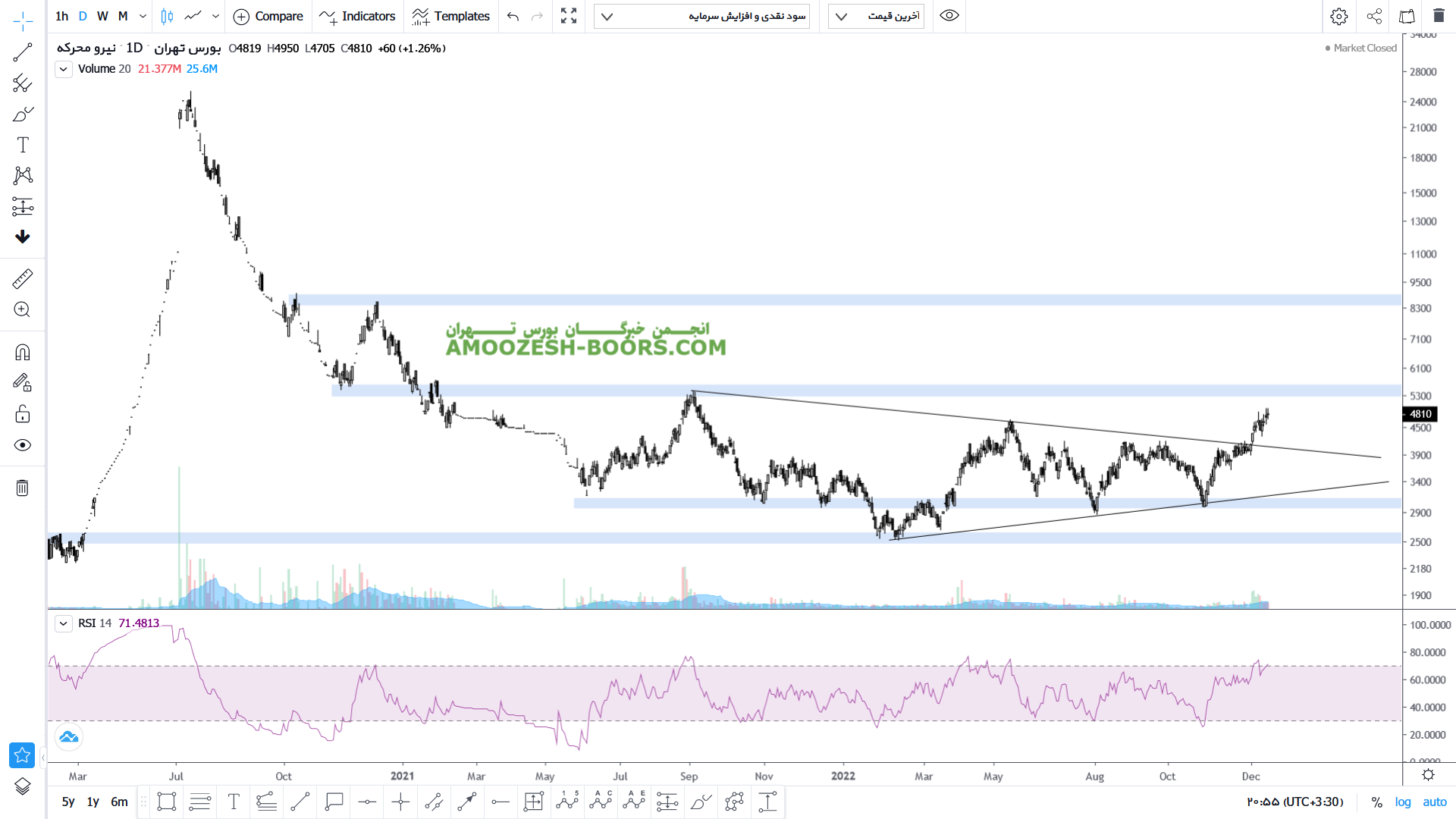 قیمت سهم خمحرکه پس از برخورد به ناحیه حمایتی ۳۱۰ تومان و بروز واکنش مثبت نسبت به این ناحیه حمایتی رشد کرده و اکنون ناحیه مقاومتی ۵۴۰ تومان را پیش روی خود دارد که در صورت اصلاح قیمت سهم خمحرکه میتواند مجدد تا حمایت ناحیه 310 تومان اصلاح کند اما در صورت رشد و شکست ناحیه مقاومتی ۵۴۰ تومان قیمت می تواند رشد خود را تا ناحیه ۸۶۰ تومان نیز ادامه دهد.