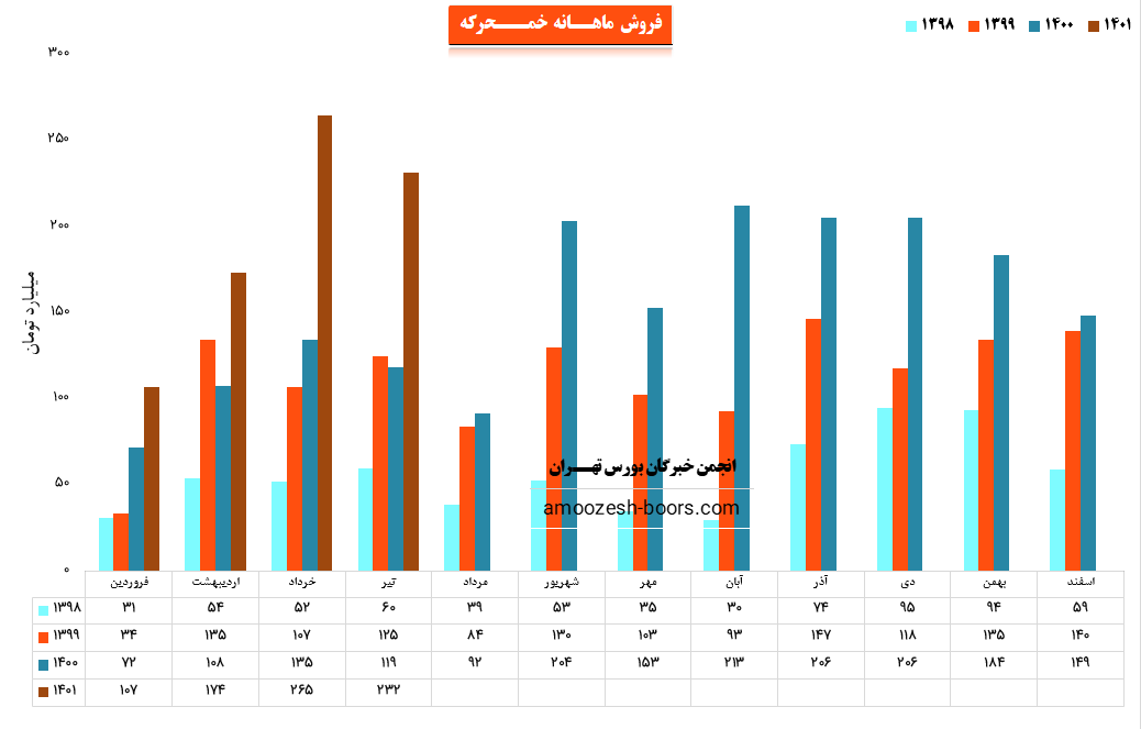نماد خمحرکه (شرکت صنعتی نیرو محرکه) در تیر ماه ۱۴۰1 حدود مبلغ 232 میلیارد تومان درآمد داشته که این میزان در مقایسه با ماه گذشته 12% کاهش و همچنین در مقایسه با مدت مشابه سال گذشته 95% رشد درآمد پیدا کرده است.