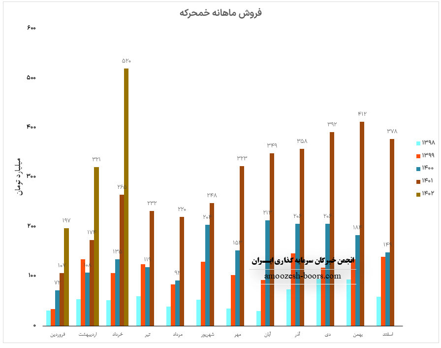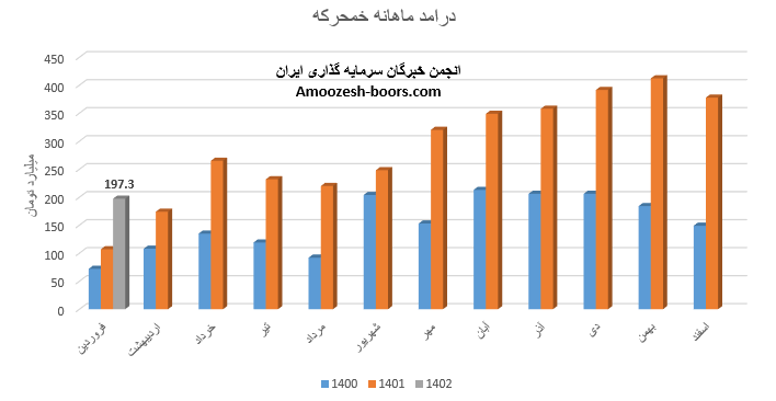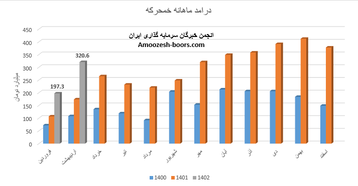 فروش ماهانه نماد خمحرکه در تیر ماه سال 1402 با کاهش 30 درصدی نسبت به ماه گذشته به 366 میلیارد تومان رسیده است، عملکرد ماهانه سهم خمحرکه نسبت به متوسط ماهانه 6% و نسبت به مدت مشابه 58% رشد داشته است، محصول اصلی صنعتی نیرو محرکه گیربکس پژو 405 میباشد که با افت 11 درصدی مقدار فروش و میزان تولید مواجه بوده است، نرخ فروش این محصول افزایش 2 درصدی را تجربه نموده است، مجموع عملکرد خمحرکه از ابتدای سال مالی رشد 81 درصدی نسبت به مدت مشابه داشته و طی این مدت 41% از کل درآمد سال قبل تحقق یافته است.