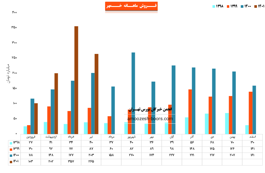 سهم خمهر (شرکت مهرکام پارس) در تیر ماه ۱۴۰1 حدود مبلغ 265 میلیارد تومان درآمد داشته که این میزان در مقایسه با ماه گذشته 26% کاهش و همچنین در مقایسه با مدت مشابه سال گذشته 31% رشد درآمد پیدا کرده است.