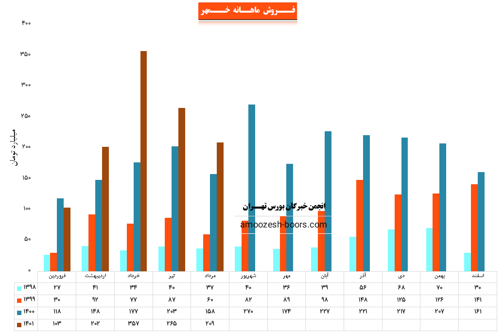 نماد خمهر با ثبت فروش ۷۵۷ میلیارد تومانی در انتهای سه ماهه ابتدایی سال مالی ۱۴۰۱ توانست حدود ۲۳ % از پیش بینی درآمد سال خود را محقق سازد.