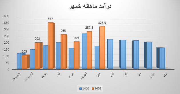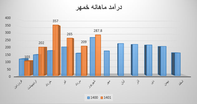 سهم خمهر (شرکت مهرکام پارس) در مرداد ماه ۱۴۰1 حدود مبلغ 209 میلیارد تومان درآمد داشته که این میزان در مقایسه با ماه گذشته 21% کاهش و همچنین در مقایسه با مدت مشابه سال گذشته 32% رشد درآمد پیدا کرده است.
