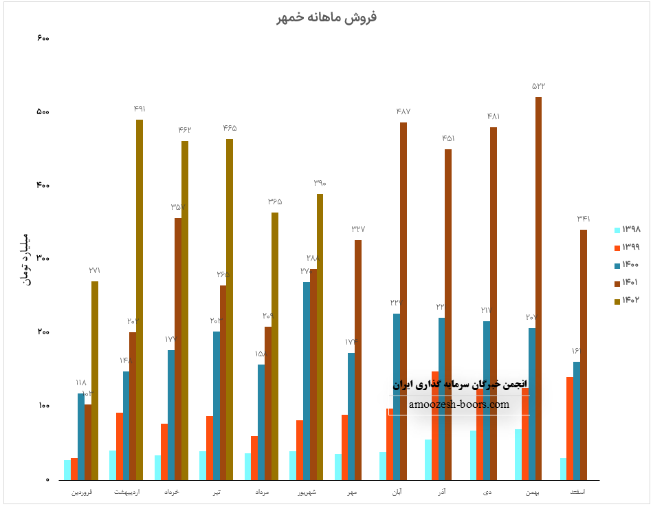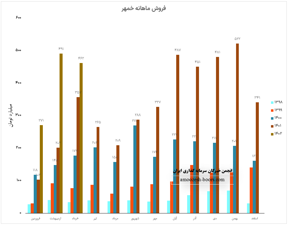 مجموع عملکرد 5 ماهه سهم خمهر در مقایسه با مدت مشابه افزایش 81 درصدی داشته و طی این مدت 50% از کل درآمد سال قبل محقق گردیده است.