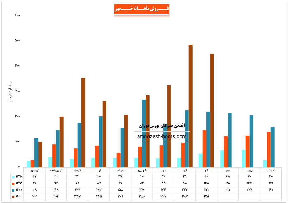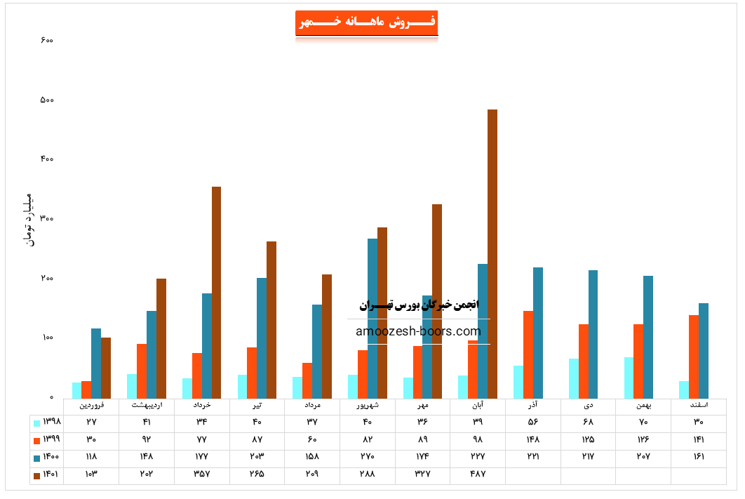 سهم خمهر در آبان ماه حدود بیش از 97/900 مجموعه از محصولات خود را به فروش رسانده که این میزان در مقایسه با حجم فروش ماه گذشته خود حدود 22% افزاش پیدا کرده است.