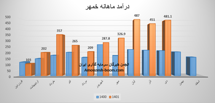 سهم خمهر (شرکت مهرکام پارس) در آبان ماه ۱۴۰1 حدود مبلغ 487 میلیارد تومان درآمد داشته که این میزان در مقایسه با ماه گذشته 49% و همچنین در مقایسه با مدت مشابه سال گذشته 115% رشد درآمد پیدا کرده است.