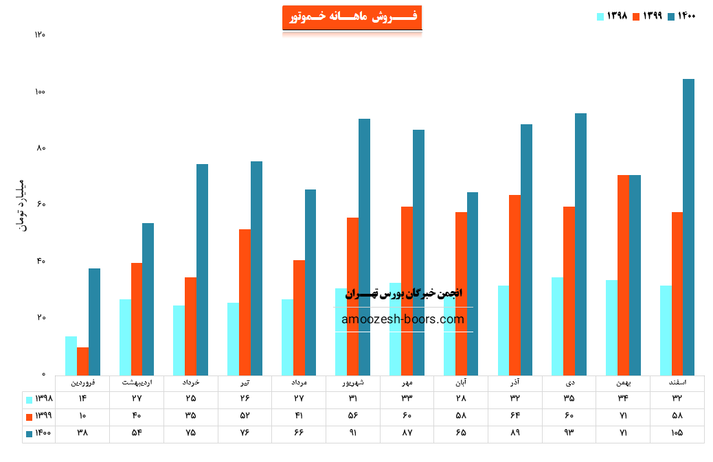 شرکت موتورسازان با نماد خموتور در اسفند ماه ۱۴۰۰ حدود مبلغ ۱۵۰ میلیارد تومان درآمد داشته که این میزان در مقایسه با ماه گذشته ۴۸ % و همچنین در مقایسه با مدت مشابه سال گذشته ۸۱ % رشد درآمد داشته است.