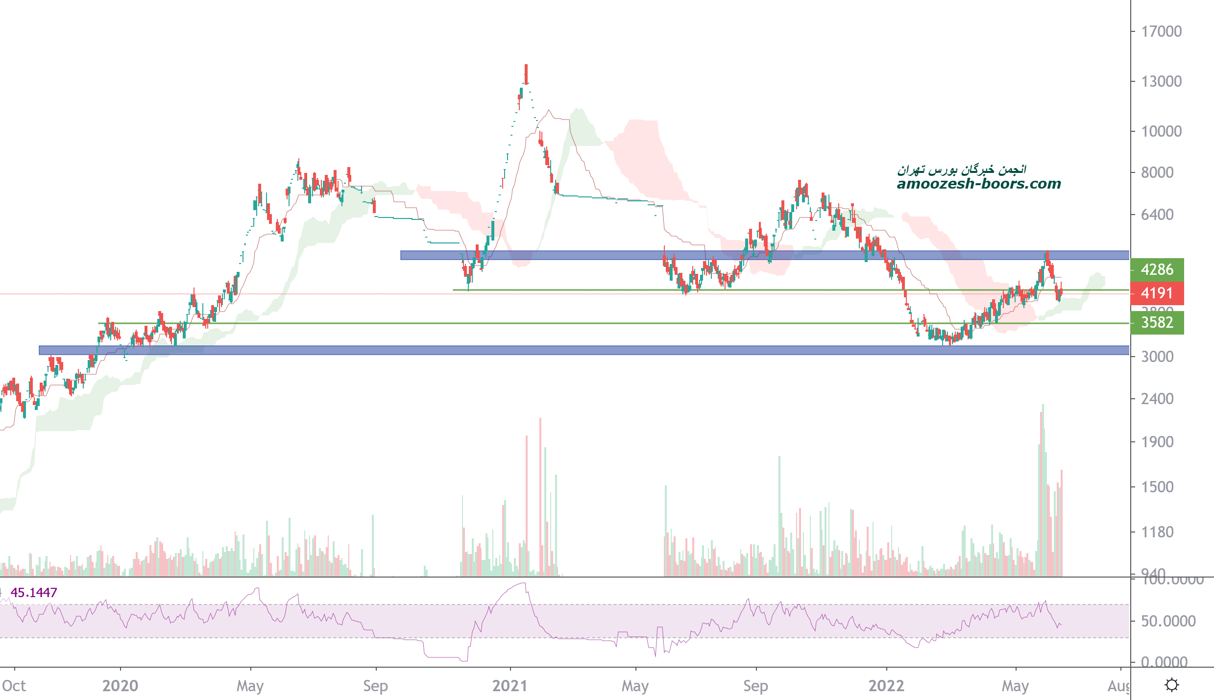 در حال حاضر قیمت درگیر خط حمایتی استاتیک 4300 ریال میباشد،در صورت ادامه دار شدن فشار عرضه و شکست این حمایت،حمایت بعدی 3500 ریال در نظر گرفته خواهد شد که در این صورت حد ضرر فعال خواهد شد و همچنین در صورت تثبیت،حرکت قیمت تا 5200 ریال دور از ذهن نخواهد بود.