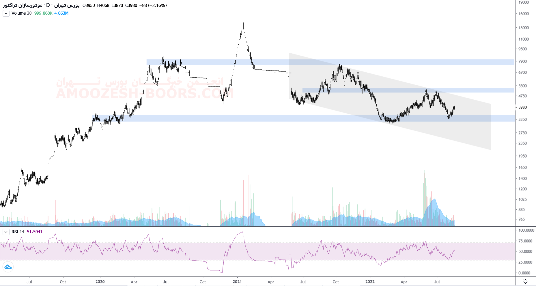 قیمت سهم خموتور پس از برخورد به ناحیه حمایتی ۳۴۰ تومان با بروز واکنش مثبت نسبت به این ناحیه حمایتی رشدی را آغاز کرده و طی آن مقاومت ناحیه سقف کانال نزولی را پیش رو دارد که در صورت شکست آن می تواند تا مقاومت ناحیه ۵۰۰ تومان نیز رشد خود را ادامه دهد اما در صورت بروز واکنش منفی نسبت به این ناحیه مقاومتی و اصلاح مجدد قیمت میتواند برای بار سوم ناحیه حمایتی ۳۴۰ تومان را تست کند.