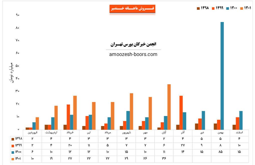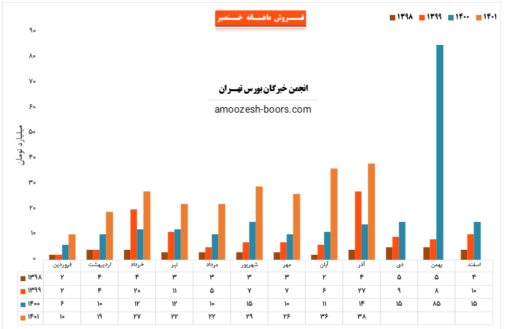 نماد خنصیر در آذر ماه حدود 69650 قطعه از محصولات خود را به فروش رسانده که این میزان در مقایسه با حجم فروش ماه گذشته حدود 4% کاهش پیدا کرده است.