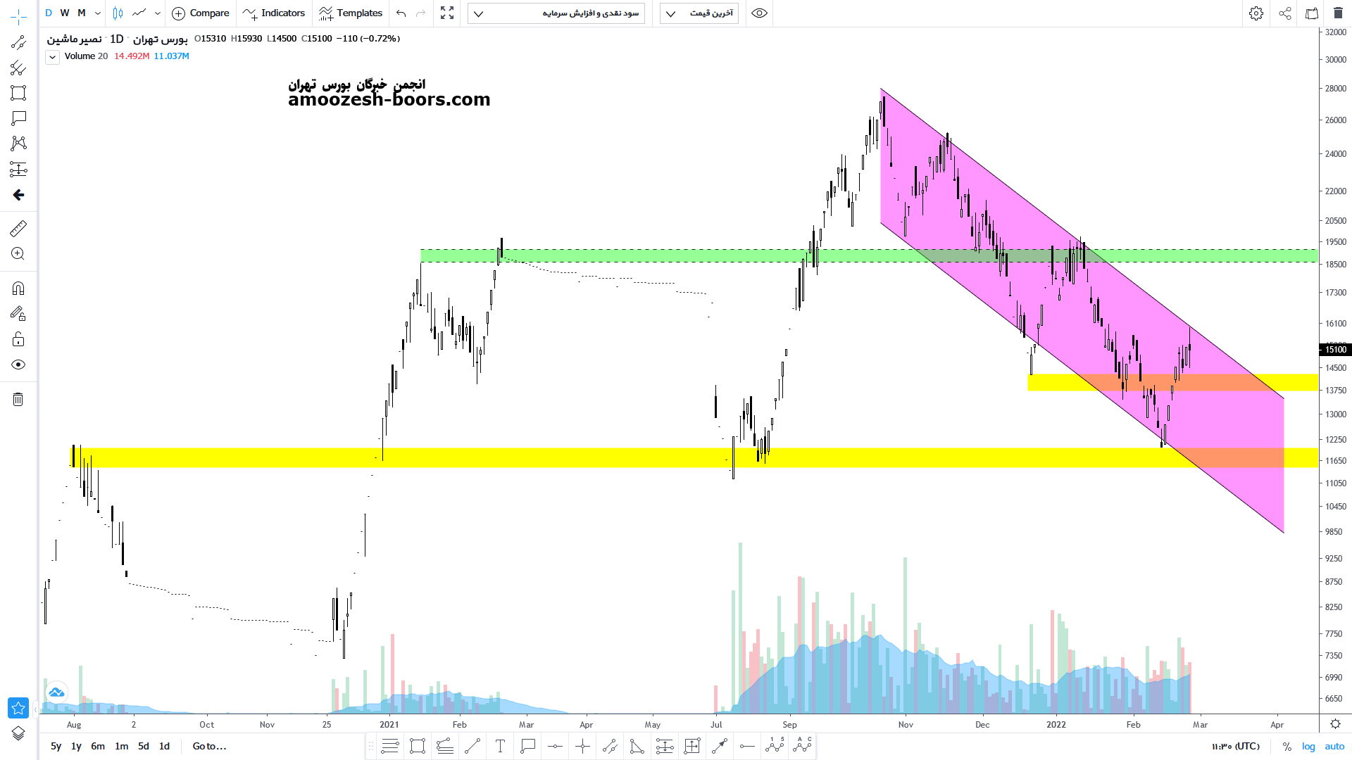 قیمت پس از برخورد به کف کانال نزولی کوتاهمدت خود و پس از حدود ۲۶ % رشد به محدوده سقف کانال رسیده است که در صورت قدرت داشتن خریداران و وجود تقاضای زیاد در سهم و طی ان شکست محدوده مقاومتی می تواند تا محدوده ۱۹۰۰ تومان نیز صعود خود را ادامه دهد اما در صورت بروز واکنش منفی به این محدوده مقاومتی قیمت حمایت های به ترتیب ۱۴۰۰ تومان و ۱۱۵۰ تومان را پیش روی خود دارد که می تواند مقصد اصلاح باشد.