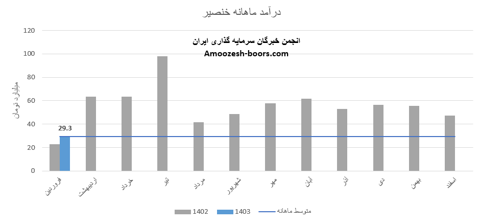 درآمد ماهانه خنصیر نسبت به ماه گذشته 2% و نسبت به متوسط ماهانه 72% افزایش و نسبت به خرداد سال گذشته 20% کاهش داشته است.