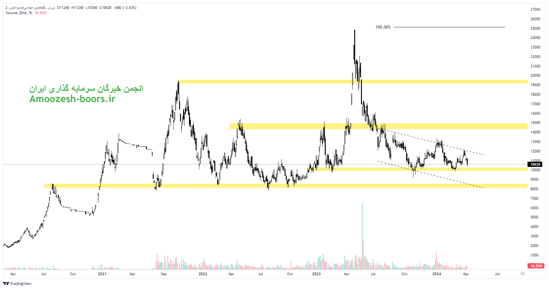 سهم خنصیر حمایت مهم ناحیه 10000 ریال را پیش روی خود دارد که در صورت ایجاد تقاضا در سهم و عبور از مقاومت سقف کانال نزولی، به روند صعودی بازگشته لذا در همین مسیر مقاومتهای ۱۴۸۰۰ ریال، 19500 ريال و 25000 ريال مهمترین مقاومتهای سهم خنصیر به حساب میآیند. همچنین در صورت از دست رفتن حمایت ناحیه ۱۰۰۰۰ ریال مهمترین حمایت بعدی سهم خنصیر ناحیه ۸۳۰۰ ریال میباشد.