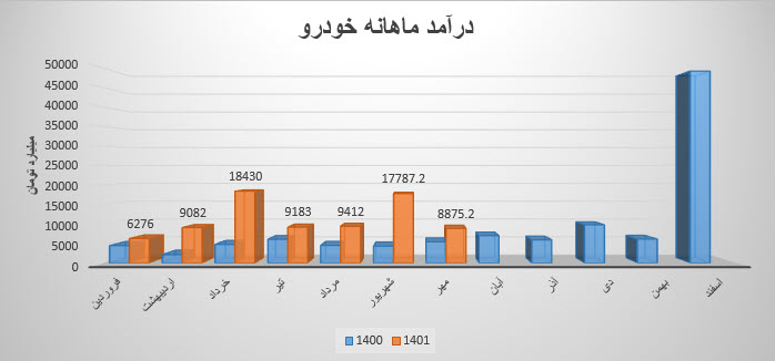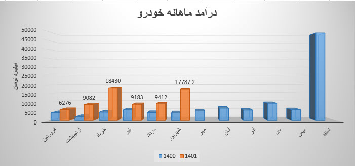 سهم خودرو (شرکت ایران خودرو) در دوره یک ماهه منتهی به 31 شهریور ماه 1401، مبلغ 17,787.2 میلیارد تومان درآمد داشته است که نسبت به ماه قبل 89% افزایش و نسبت به میانگین ماه های قبل 70% افزایش داشته است.