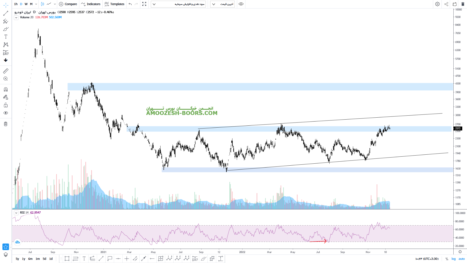 قیمت سهام خودرو بر روی مقاومت مهم ناحیه ۲۵۵ تومان قرار دارد که می تواند با شکست این مقاومت رشد خود را تا سقف کانال صعودی که تشکیل داده ادامه دهد. در صورتی که قیمت به این ناحیه مقاومتی واکنش نشان دهد حمایت کف کانال صعودی حمایت اصلی قیمت نماد خودرو می باشد.