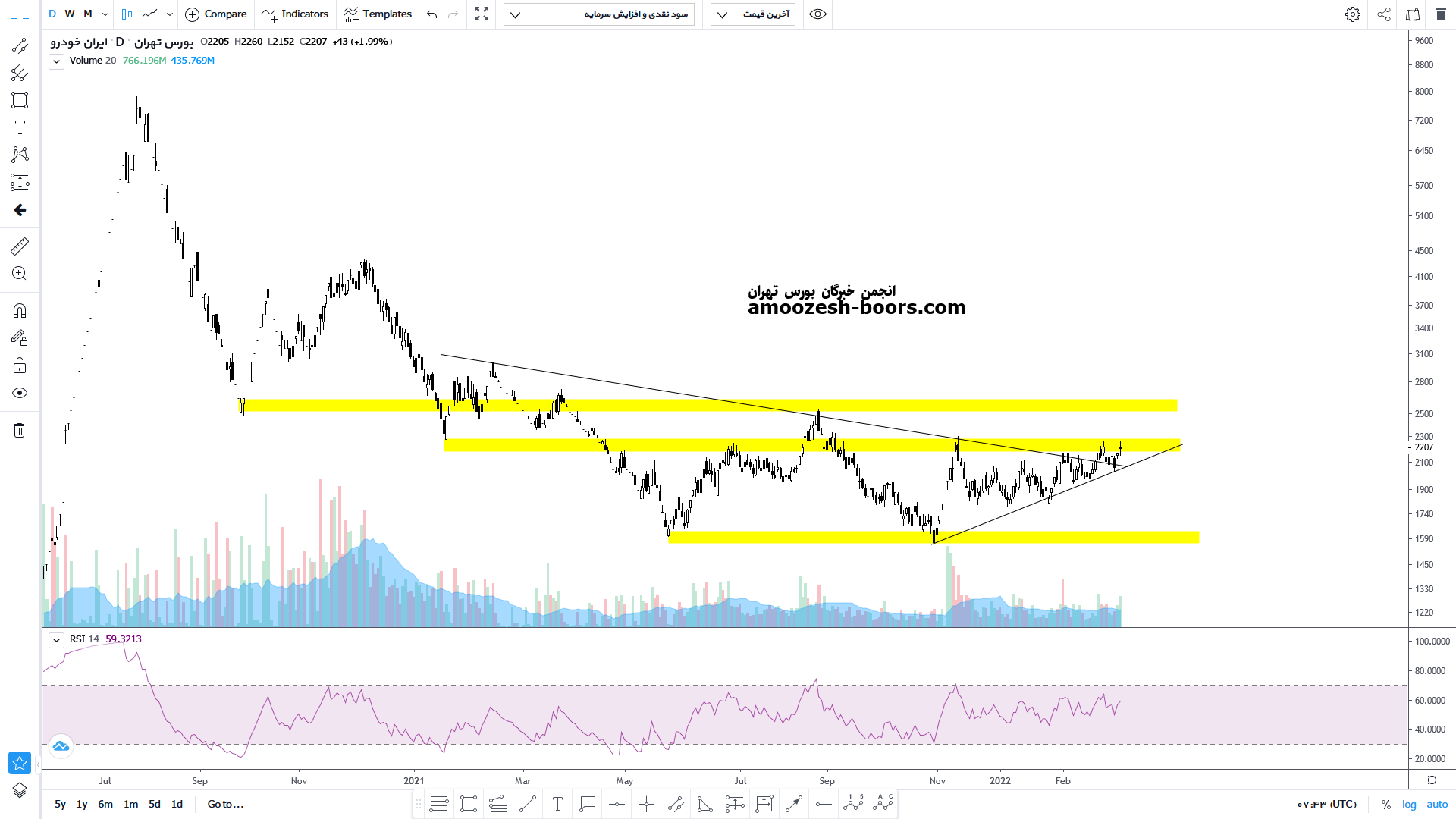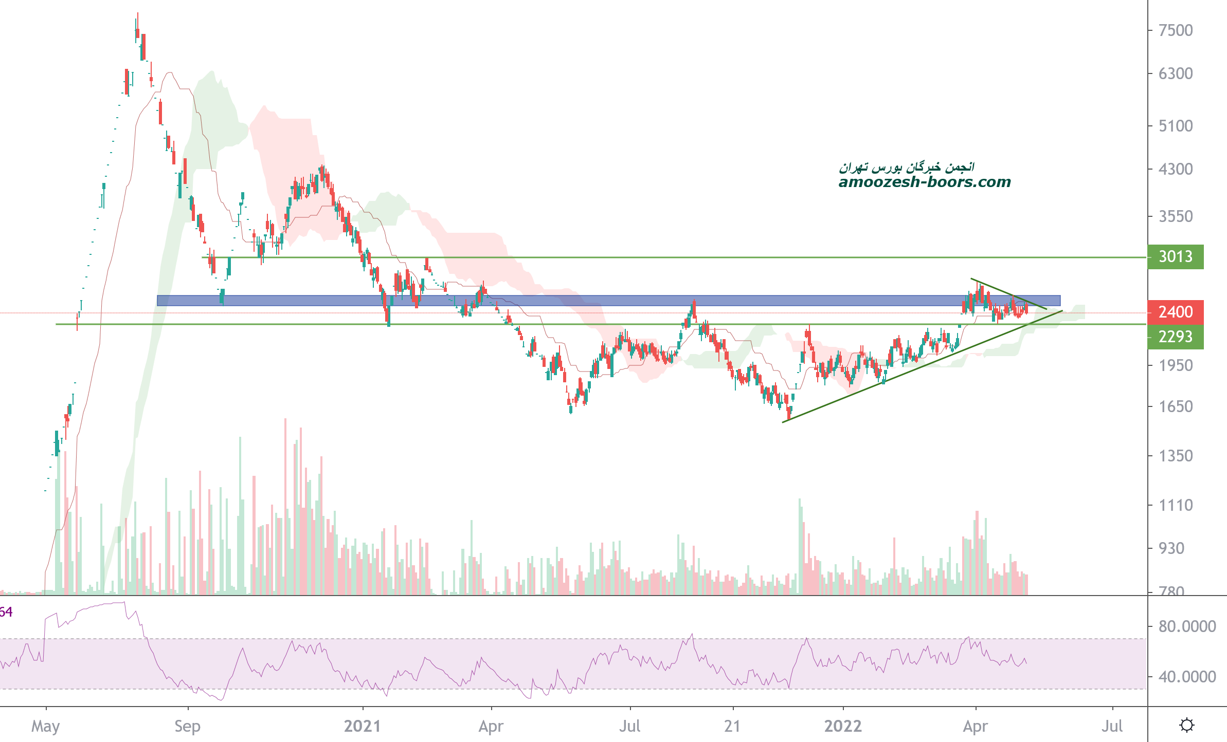 قیمت پس از شکست خط روند نزولی خود و انجام پولبک به آن اکنون به محدوده مقاومتی مهم ۲۳۰ تومان رسیده است در صورت توانایی قیمت در شکست این محدوده مقاومتی رشد تا محدوده مقاومتی بعدی یعنی محدوده ۲۶۰ تومان ادامه پیدا خواهد کرد اما در صورت عدم تایید پولبک و برگشت مجدد به زیر محدوده مقاومتی ، حمایت خط روند صعودی خود را دارد که در صورت شکست آن می تواند مجددا تا کف ۱۶۰ تومان نزول خود را ادامه دهد.