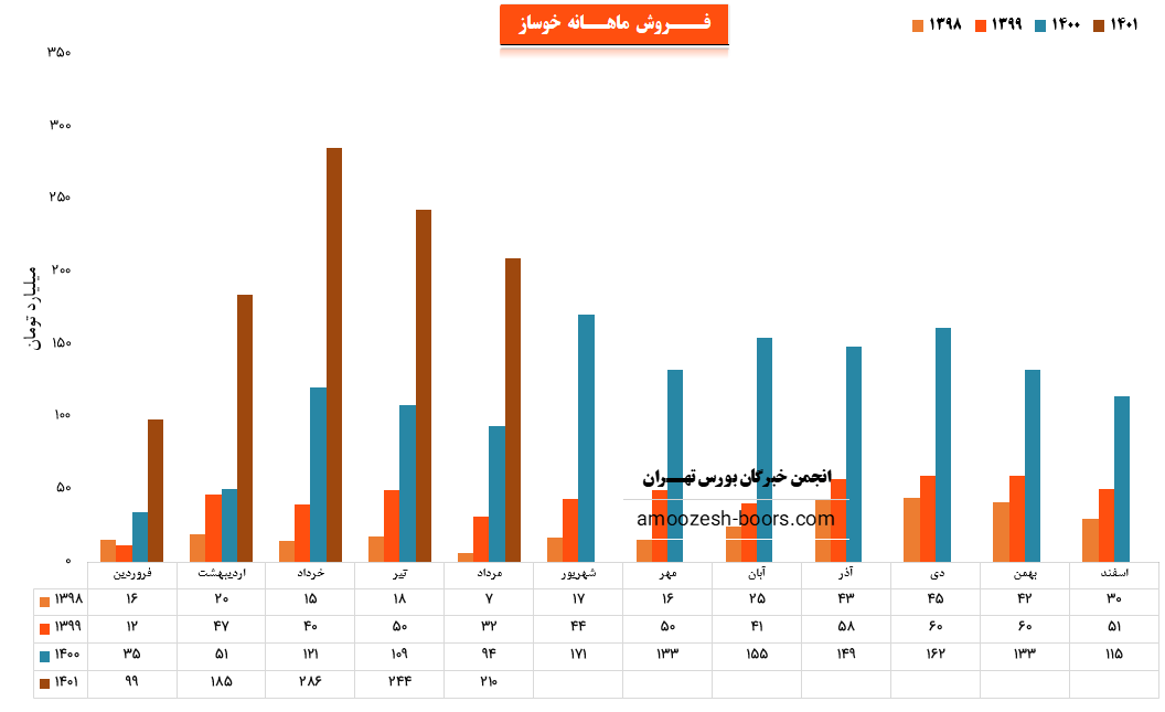 نماد خوساز (شرکت صنعتی محورسازان ایران خودرو) در مرداد ماه ۱۴۰1 حدود مبلغ 210 میلیارد تومان درآمد داشته که این میزان در مقایسه با ماه گذشته 14% کاهش و همچنین در مقایسه با مدت مشابه سال گذشته 123% رشد درآمد پیدا کرده است.