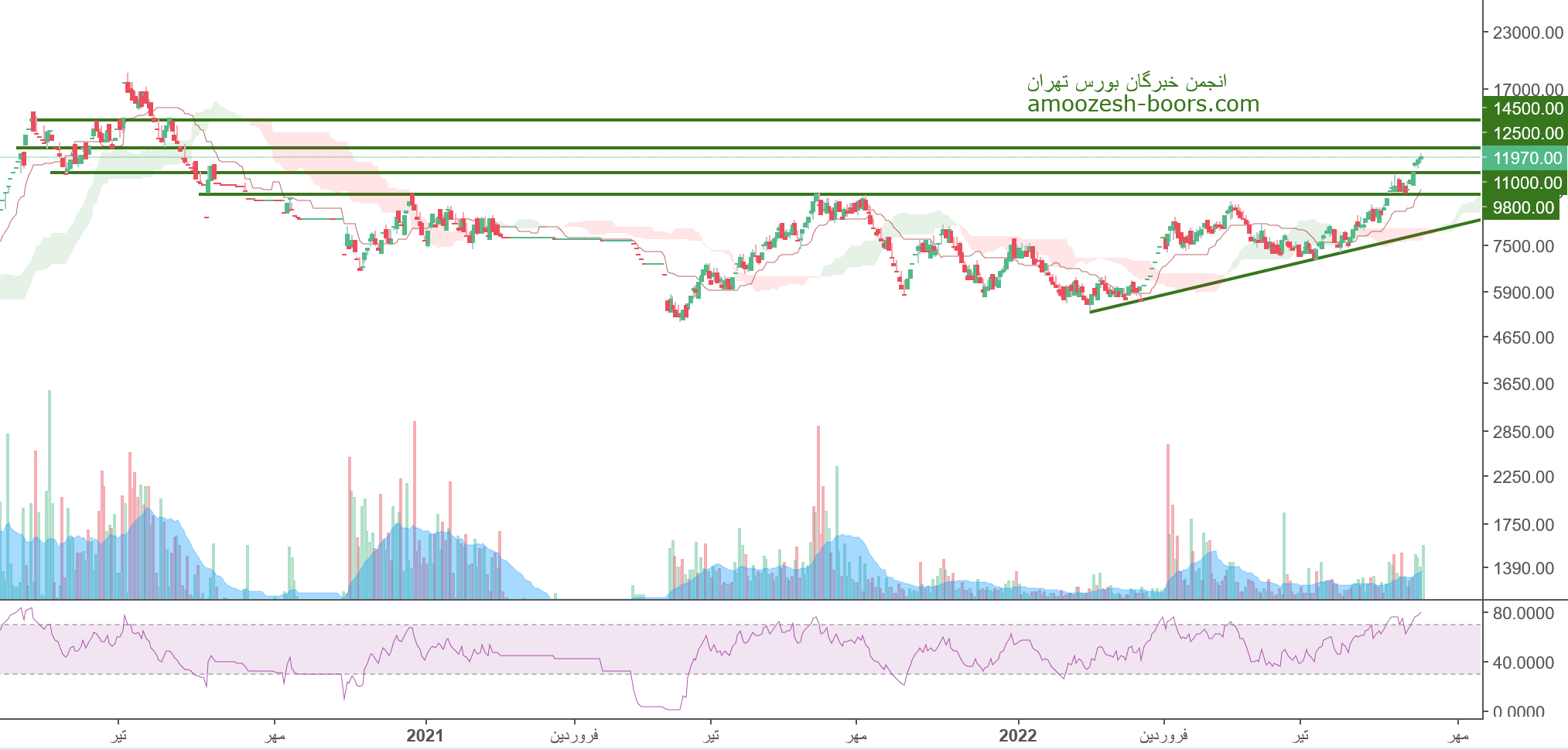 قیمت سهام خوساز در حال حاضر مقاومت 12500 ریال را دارا میباشد، در صورت عبور از این مقاومت حرکت سهم تا 14500 ریال دور از ذهن نخواهد بود، همچنین در صورت اصلاح، حمایت بعدی نماد خوساز 11000 ریال خواهد بود که در این صورت حد ضرر فعال میگردد.