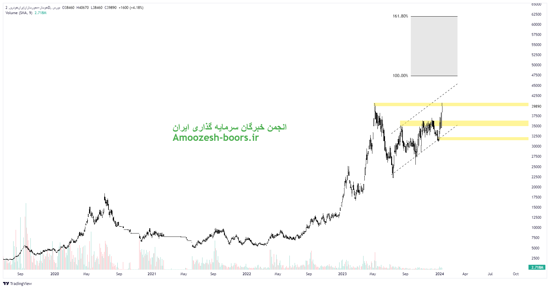 قیمت سهم خوساز مقاومت مهم ناحیه 4000 تومان را پیش روی خود دارد که در صورت حفظ تقاضای به وجود آمده در کلیت بازار و همچنین عبور از این ناحیه، حرکت سهم خوساز به سمت مقاومتهای ۴۷۰۰ و ۶۲۰۰ تومان در میان مدت ادامه خواهد داشت. همچنین در صورت بروز واکنش منفی به مقاومت ناحیه ۴۰۰۰ تومان و همچنین ایجاد فشار عرضه در کلیت بازار، حمایتهای معتبر سهم خوساز ناحیه ۳۵۰۰ و ۳۲۰۰ تومان در نظر گرفته خواهد شد.