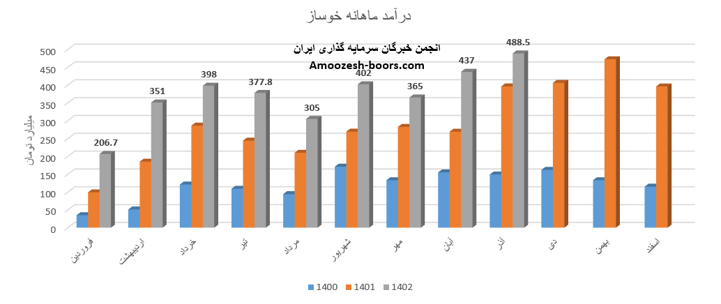 فروش آذر ماه سال 1402 سهم خوساز 488.5 میلیارد تومان گزارش شده است، تغییرات درآمدی خوساز به شرح زیر میباشد: