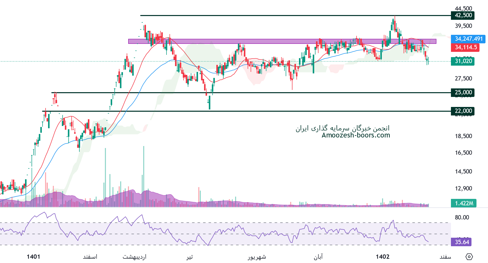 تحلیل تکنیکال سهم خوساز نشان میدهد که قیمت در محدوده مقاومتی 36000 ریال و حمایتی 28000 ریال در حال نوسان میباشد، در صورت شکست هر یک از سطوح، مقاومت بعدی سهم خوساز 42500 ریال و در صورت ایجاد فشار فروش حمایت بعدی خوساز 25000 ریال در نظر گرفته میشوند.