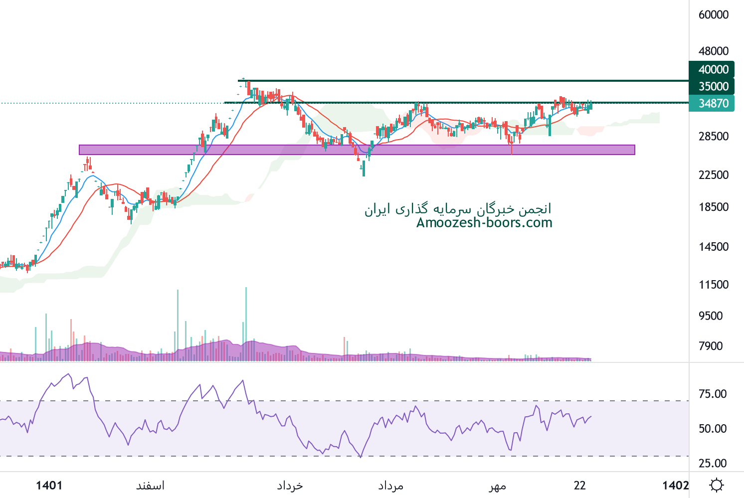 در بررسی نمودار تکنیکال نماد خوساز ، قیمت سهم در حال حاضر سطح مقاومتی 35000 ریال را دارا میباشد، در صورت ادامه دار شدن روند صعودی و عبور قیمت خوساز از این سطح مقاومتی، مقاومت بعدی سهم خوساز سطح 40000 ریال ارزیابی میگردد، همچنین در صورت ورود قیمت به فاز اصلاحی، اولین حمایت خوساز 25000 ریال در نظر گرفته خواهد شد.