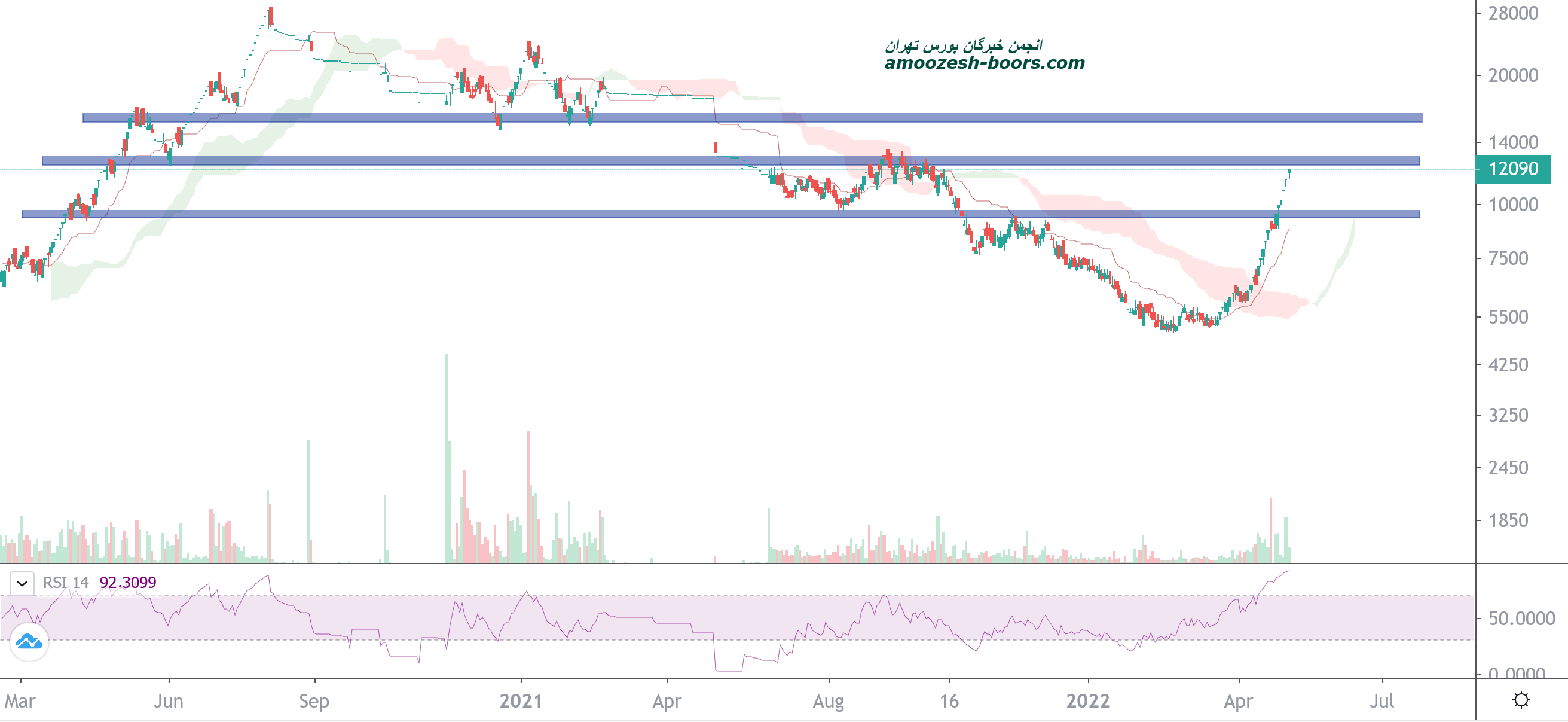 قیمت در حال صعود شارپی به محدوده مقاومتی استاتیک در محدوده 12000 ریال رسیده است در صورت ادامه دار شدن فشار تقاضا و عبور از این مقاومت و تثبیت بالای آن حرکت قیمت تا 15500 ریال محتمل خواهد بود و در صورتی که قیمت وارد فاز اصلاحی شود اولین حمایت سهم محدوده حمایتی،روانی و عدد رند 10000 ریال در نظر گرفته خواهد شد.