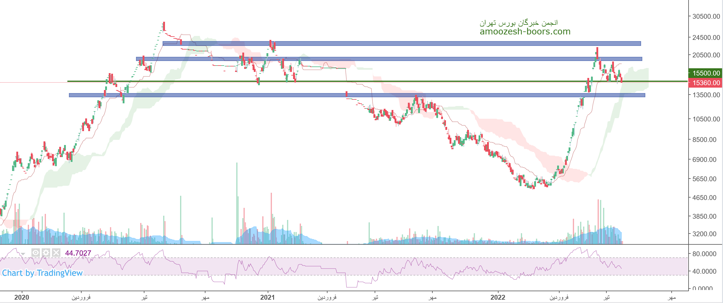 خچرخش در حال حاضر حمایت 15500 ریال را دارا میباشد، در صورت تثبیت قیمت حرکت سهم تا 17500 ریال دور از ذهن نخواهد بود، همچنین در صورا از دست رفتن این حمایت، حمایت بعدی 13000 ریال در نظر گرفته خواهد شد که در این صورت حد ضرر فعال میگردد.