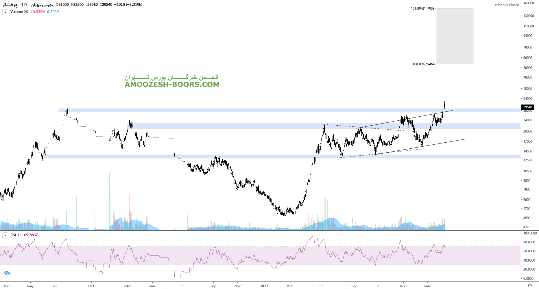 قیمت سهم خچرخش پس از خروج ناموفق از الگوی استراحت خود در قالب یک کانال صعودی در حال رشد می باشد که اکنون توانسته مقاومت مهم سقف کانال صعودی و همچنین مقاومت سقف تاریخی ناحیه ۲۸۰۰ تومان را از سر راه خود بردارد. لذا در صورت تداوم رشد مقاومت ناحیه ۶۰۰۰تومان اولین مقاومت سهم خچرخش در نظر گرفته شده است. همچنین در صورت برگشت مجدد به درون کانال حمایت اصلی سهم خچرخش ناحیه 2200 تومان تعیین شده است.