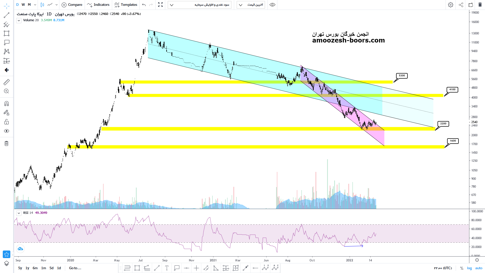 درصورتیکه قیمت بتواند تثبیتی بر شکست سقف کانال نزولی کوتاهمدت خود نشان دهد د می تواند رشد خود را تا محدوده مقاومتی کف کانال قبلی و در صورت شکست آن تا محدوده ۴۱۰ تومان نیز رشد خود را ادامه دهد اما در صورت برگشت مجدد و شکست محدوده حمایتی ۲۲۰ تومان این ریزش تا محدوده کف کانال نزولی و محدوده حمایتی کلاسیکی ۱۶۰ تومان ادامه خواهد داشت.