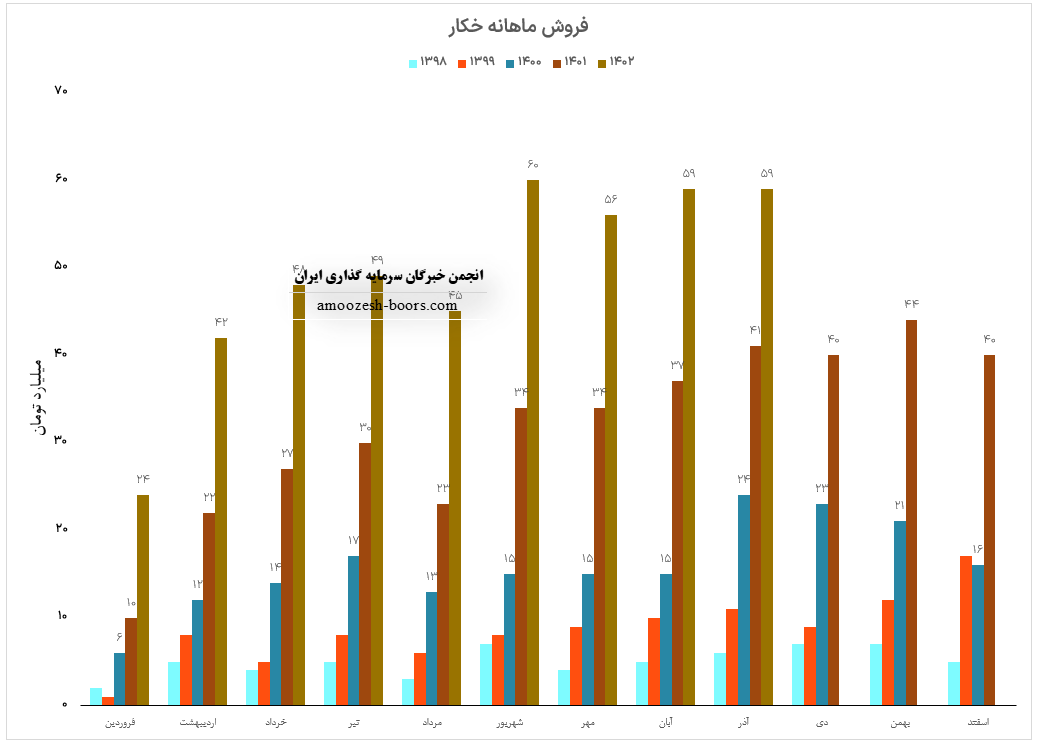 سهم خکار در آذر ماه حدود بیش از 40300 عدد از محصولات خود را به فروش رسانده که این میزان در مقایسه با حجم فروش ماه گذشته خود حدود 35% کاهش پیدا کرده است.