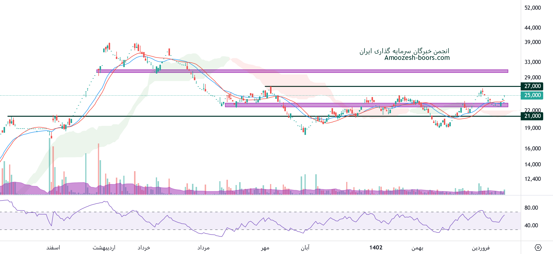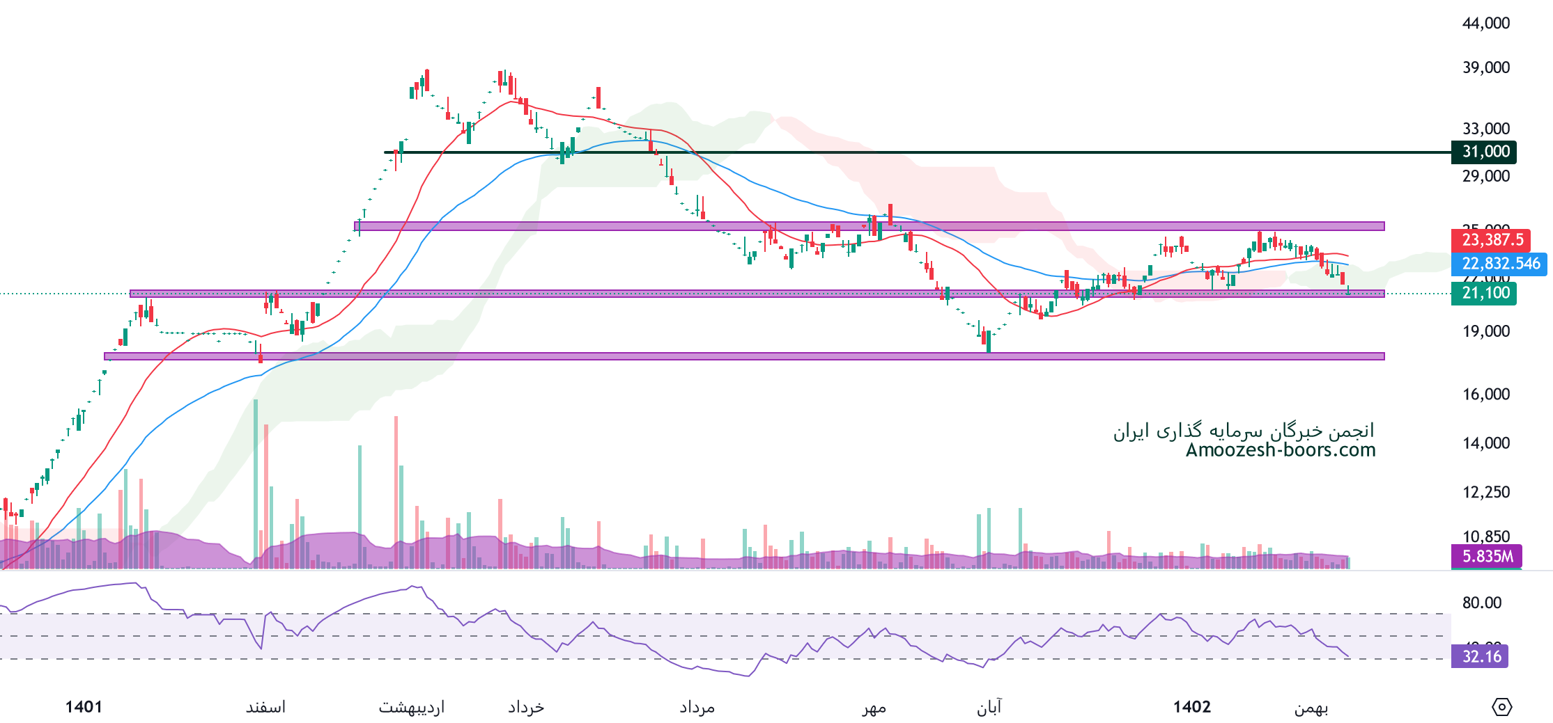 بعد از اصلاحی که روی چارت انجام شده قیمت به محدوده امنی رسیده است و به این محدوده واکنش مثبت نشان داده است، محدوده حمایت خکاوه محدوده 22700 ریال ارزیابی میگردد، در صورت تثبیت قیمت در این محدوده و ثبت کندل های مثبت، میتوان انتظار حرکت قیمت تا محدوده 27000 ریال را داشت، همچنین در صورت ادامه دار شدن اصلاح و از دست رفتن حمایت نماد خکاوه که در بالا ذکر شد، حمایت بعدی 21000 ریال خواهد بود.
